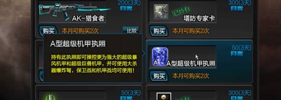 在游戏之前,我们得做好准备。保卫模式对于没有高级装备的玩家来说,机甲执照是必不可少的。目前可以通过月券购买期限版,也可以花RMB购买长一些的期限。