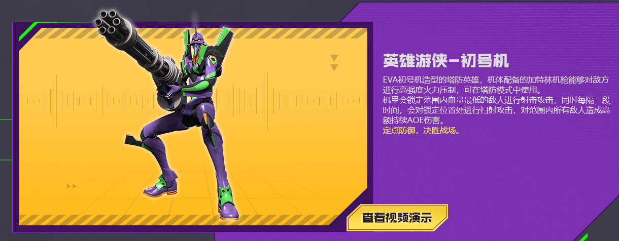 来到英雄游侠的第三款皮肤——初号机。初号机外观下的游侠不再以弓箭进行攻击,而是变为了一挺巨大的加特林机枪,能够对敌方进行高强度火力压制,初号机会锁定范围内血量最低的敌人进行扫射攻击,同时每隔一段时间,会对锁定位置处进行扫射攻击,对范围内所有敌人造成高额持续AOE伤害。
