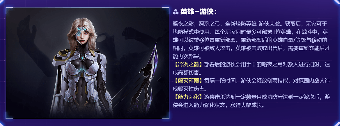 英雄—游侠,在英雄塔系列中担当的是远程射手类“强袭”英雄塔。她共有三个技能。