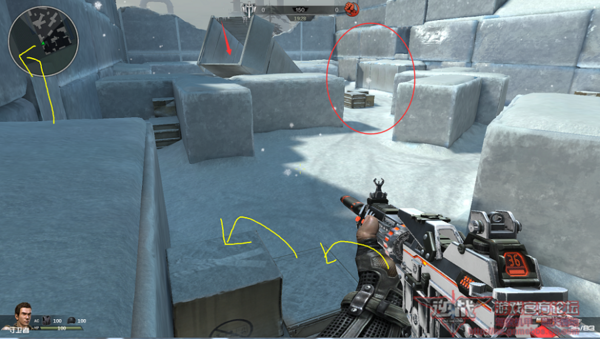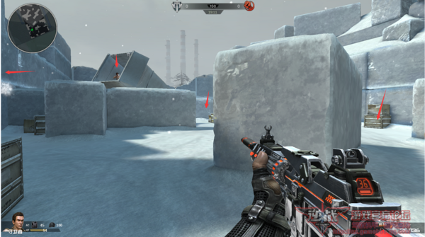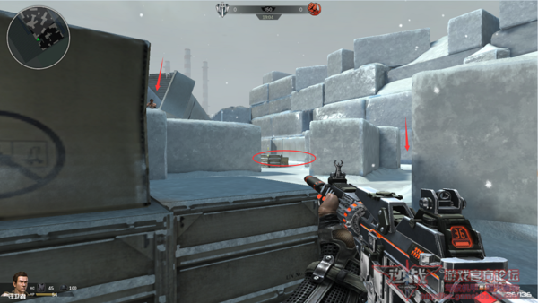 4、跳上前方的几个箱子,不要急于跳上雪墙,这里也是一个非常不错的瞄点位置。由上面的两张对比图可以看出,我们可以看到多个点位出现的突击者(多个点位的突击者也能够看到我们),我们能够看到大部分突击者的全身,而突击者只能看到我们的头部。