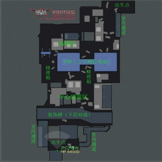 这是一张【非常大】的地图。双方的出生点位于地图最下方和右上角,可以通过开阔地以及室内的通道快速抵达主战场。主战场大致分成4块,分别是图中的装饰桥、中桥,以及两块建筑区。从连接4块主战区域之间的通道来说,此图可以大致分为左中右三路,如上图所示,左、中路是有修理箱刷新点的,最右侧的小道则没有。