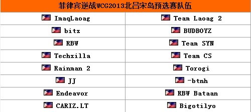 逆战菲律宾WCG2013海选赛北吕宋岛参赛队伍: