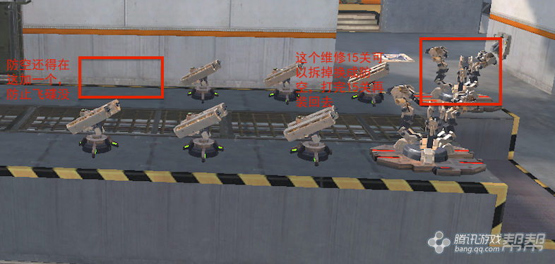 好了,说说防空,防空他这里还差了一个,按他这样放是不对的,15关飞碟很多,万一一个没下来很可能玩崩的,所以建议再加一个,还有14关打完飞机之后要把第一排的维修拆掉换成防空哦这里我也标记出来了。基本上15关一过的话,就等于70w你右一半机率能拿到了,后面只要好好打就能拿到了。