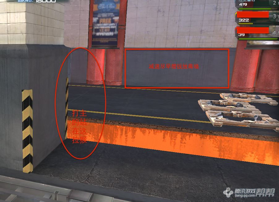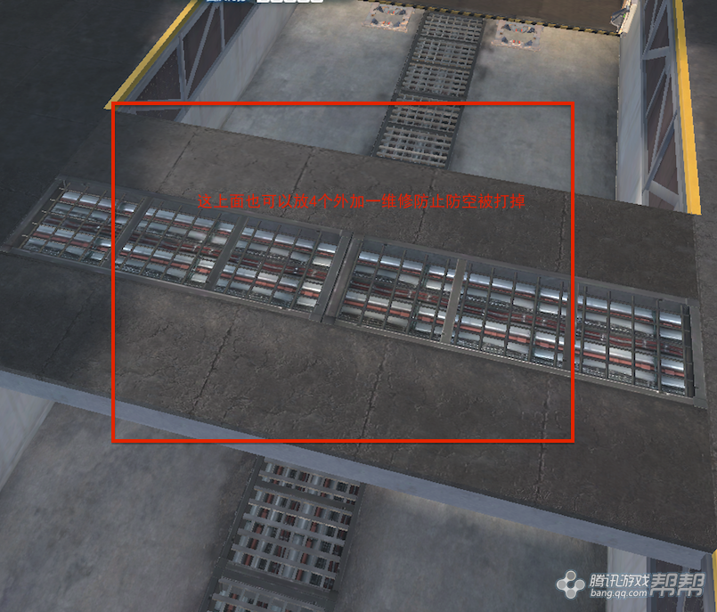 中门这里减速3个就行了 打主各卡2电墙,这里注意了,减速跟防空商量下,如果防空不肯帮你放88的话,这里就要你来放了,因为打主的是不会帮你放88的,在这里首先打主的必需先在中门各装2各吊灯,防空必需先装好切割,减速装好88后有钱再把中路维修放上,放好之后,攒钱,有钱了就再中门电墙后面装毒板。